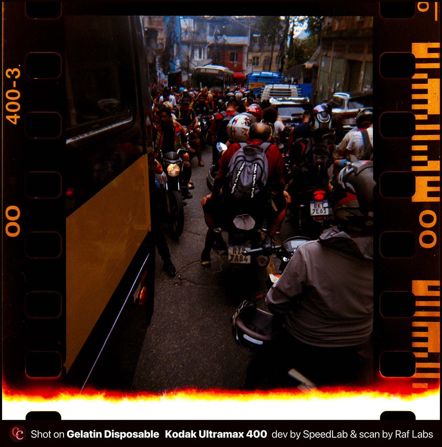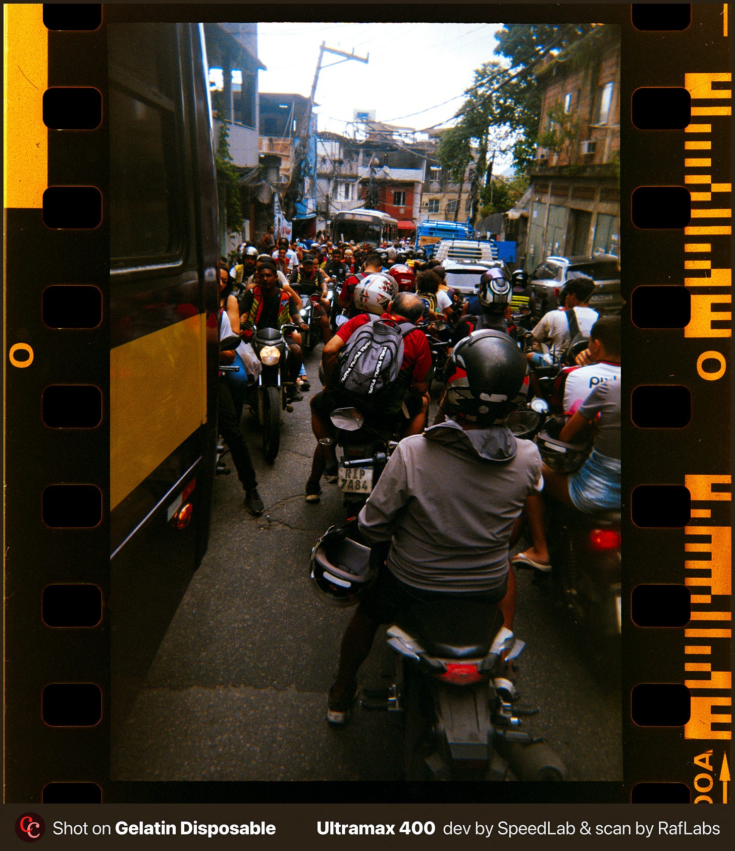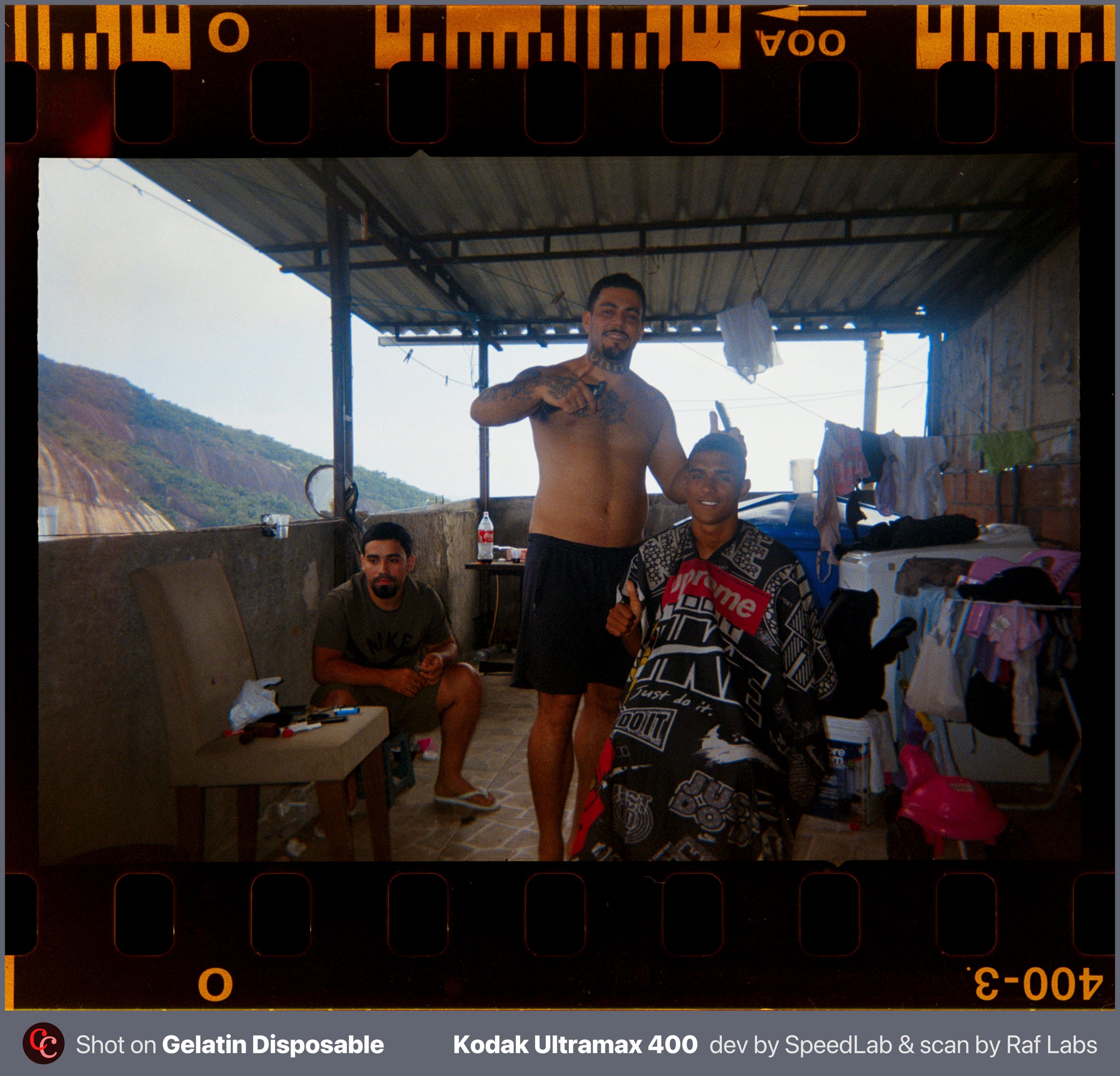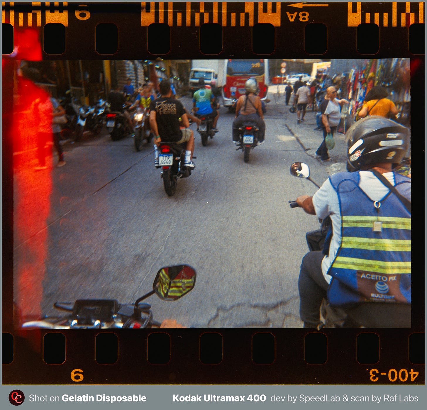 Subi preparado pra me sentir vulnerável. Levei câmeras descartáveis da Gelatin Labs. Uma no meu bolso, outra no bolso do Edgard, leves o bastante pra não chamar atenção e baratas o bastante pra não doer se sumissem. Celular no outro bolso. Nenhuma câmera boa, nenhuma Leica, e me arrependo um pouco disso, porque ainda não revelei o filme das disposables. Essa escolha de deixar a câmera boa em casa também diz algo.